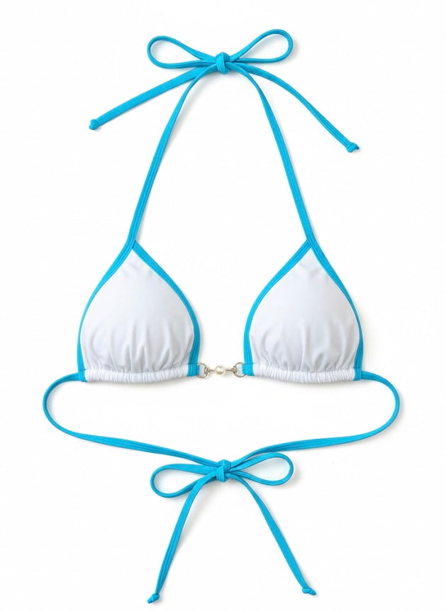 Flattering and supportive, our SOL bikini top features built-in push-up technology for the ultimate flattering fit. Designed with adjustable neck and back ties for custom comfort, it’s finished with clean blue trim and subtle front hardware for a sleek, elevated look made to enhance and define.